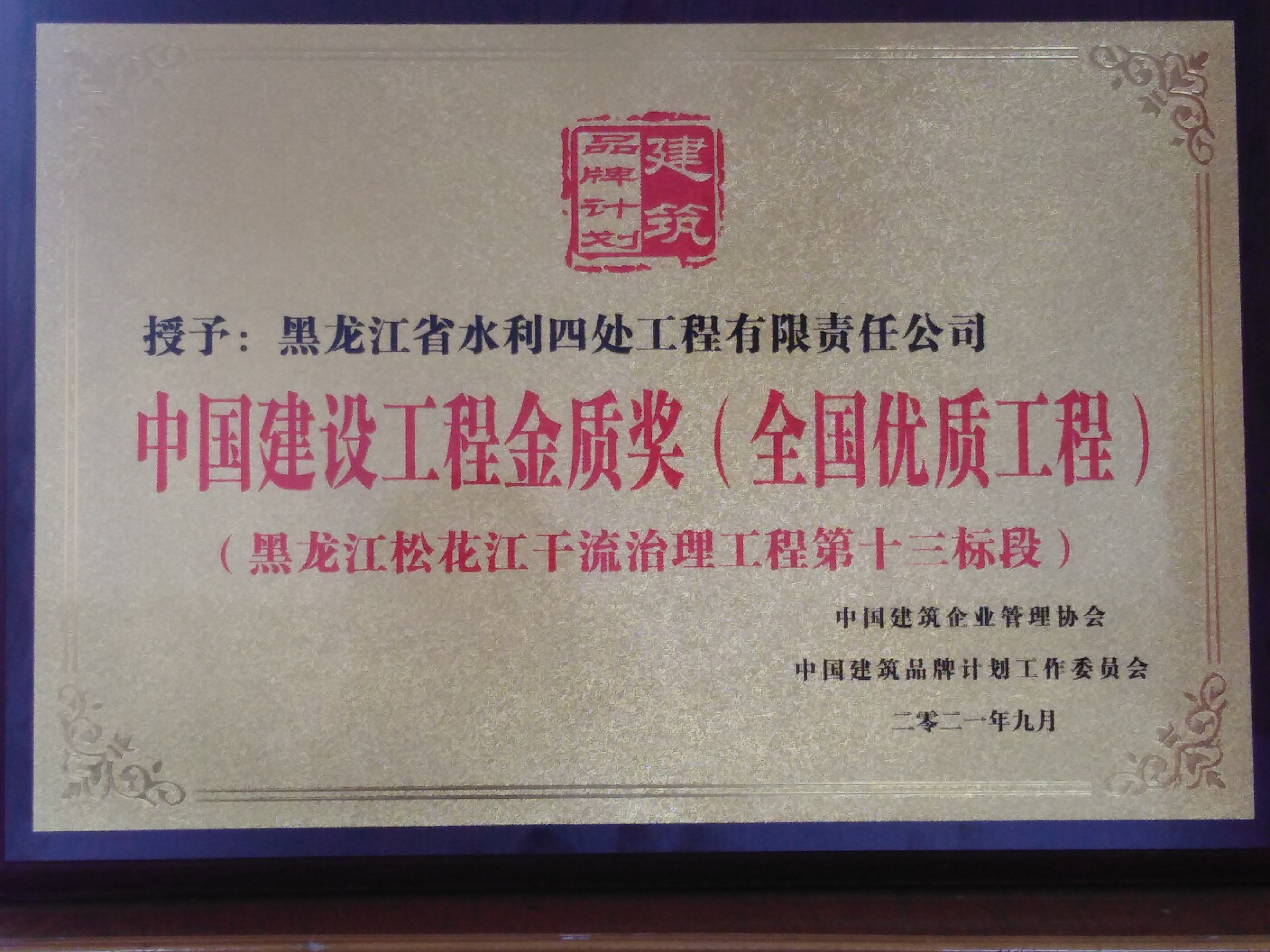2021年9月,在2021年度中國(guó)建筑品牌計(jì)劃評(píng)選活動(dòng)中,經(jīng)評(píng)委會(huì)綜合評(píng)定,我公司被中國(guó)建筑企業(yè)管理協(xié)會(huì)、中國(guó)建筑品牌計(jì)劃工作委員會(huì)授予“中國(guó)建設(shè)工程金質(zhì)獎(jiǎng)(全國(guó)優(yōu)質(zhì)工程)”。